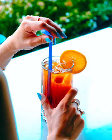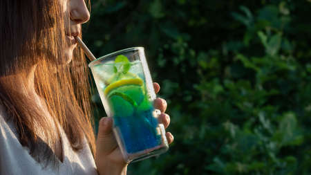 Young woman with long dark hair drinking a summer refreshing cocktail through a straw. Selective focus