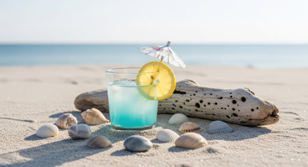 A vibrant blue cocktail garnished with a lemon slice and tiny umbrella is presented on a sandy beach. Seashells and a piece of driftwood surround the drink. The composition highlights the drink under sunny conditions. This image can be used for commercial projects related to beverages or leisure.