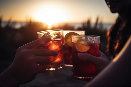 Close up of people toasting with alcoholic drink on a beach, created with Generative AI technology.