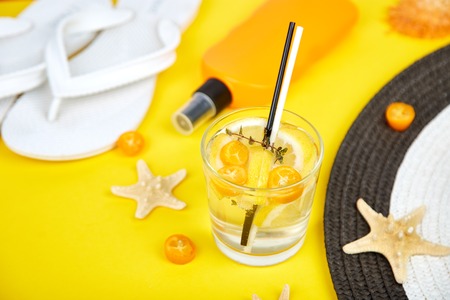 Holidays and drink concept. Cold cocktail, lemonade with lemon and kumquat, mint in a glass on a yellow table. Summer background. Detox water.