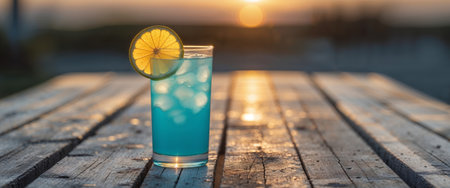 AI Generated. Refreshing Blue Beverage with Citrus Slice in Glass on Wooden Table at Sunset
