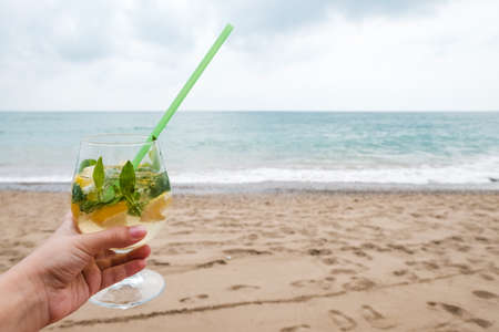 Luxury drink on sunny beach near the sea. Waves and sand in background. White female hand holding a wine glass with tropical mojito cocktail. Recreational getaway or romantic holiday on remote island.