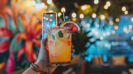 A customer snaps a photo of their beautiful mocktail against a backdrop of string lights and trendy wall art
