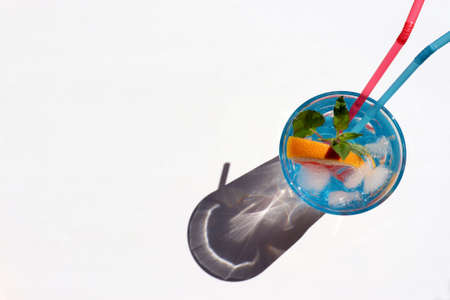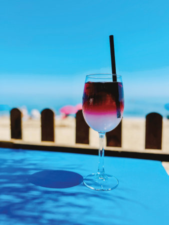 Cocktail on blue table with shadow of palm tree leaf at the beach under a blue sky. Andalucia, Spain.