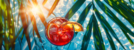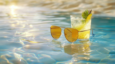 A vibrant scene featuring stylish sunglasses and a refreshing drink resting on the shimmering water surface of a tropical beach. Perfect for summer vibes!