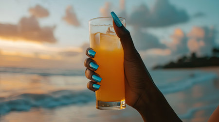 Close-up of a hand with glossy blue nails holding a refreshing tropical drink by the beach, capturing relaxation and style.