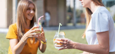 Two beautiful young women sitting on the grass and laughing while having a lemonade drink in glass jars, during a friendly hang out in city park.