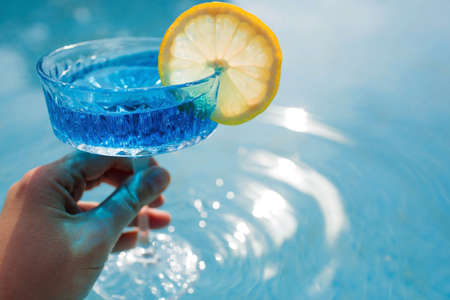 A glass of delicious blue cocktail and yellow lemons on the background of the pool. Alcoholic cocktail juicy fruit blue with curacao liqueur, ice cubes and a slice of