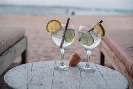 summer drinks on the beach. two glasses of cocktails with lemon, lime and ice