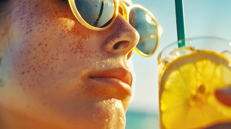 A close-up of a man wearing sunglasses, enjoying a citrus beverage with a straw on a sunny beach.