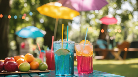 Celebration table bursting with colorful drinks, umbrellas, and bright summer fruits in a lively outdoor scene