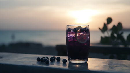 Cocktail with blueberries, lemon and ice on the beach at sunset