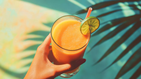 Glass of papaya and lime smoothie, held by one hand, bright orange and green tones, generative ai