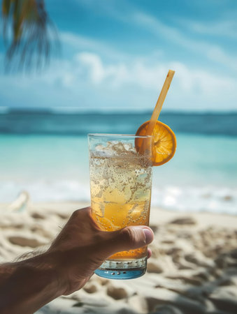 Man hand holding a glass of cocktail with orange slice on the beach