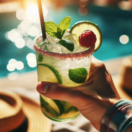 Fresh lemonade or mojito cocktail in glass with straw on a swimming poll border on sunny day.