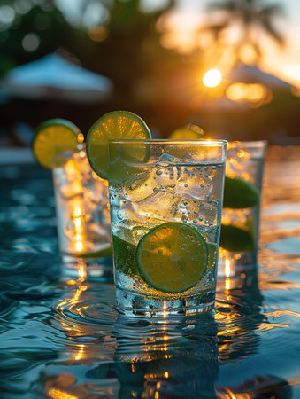 Refreshing cocktails adorned with citrus garnishes by a serene poolside