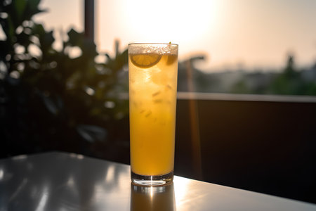 Orange juice in a glass with ice and mint leaves on the balcony at sunset