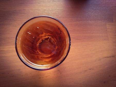 Glass of whiskey on the wooden background during sunset. Relaxation, party, evening out concept