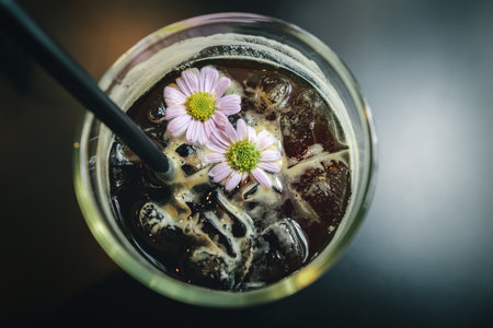 Top view of iced coffee with ice cubes, placed neatly on a simple black table with soft shadows around.