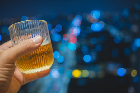 two colorful drinks in martini glass and big night city background, illuminated light skyline with skyscrapers, nightclub and party concept. High quality photo