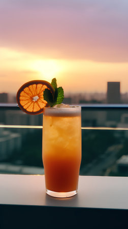 Enjoying a vibrant mojito cocktail made with fresh mint and lime, placed on a sleek bar with a stunning city backdrop at sunset. The lively atmosphere enhances the experience.