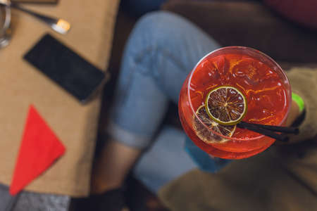 Glass of Americano Alcohol cocktail with red vermouth, bitter, soda water and ice cubes, top view.