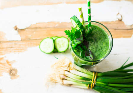 Fresh organic green smoothie with green onion, spinach, cucumber, parsley and lemon with straws on rustic wooden background
