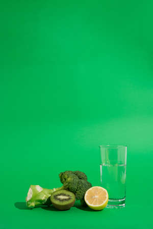 Broccoli, kiwi and lemon with glass of water with green background representing healthy diet