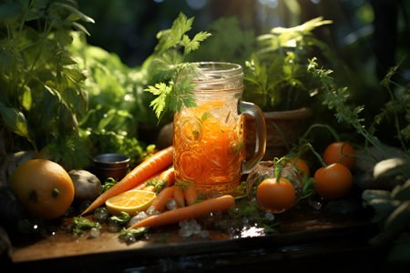 Vegetable juice and varied organic vegetable harvest on a wooden kitchen table