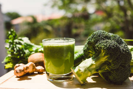Detox green smoothies concept, a glass of green diet detox drink and various fresh green vegetables such as broccoli and spirulina pills behind, front view