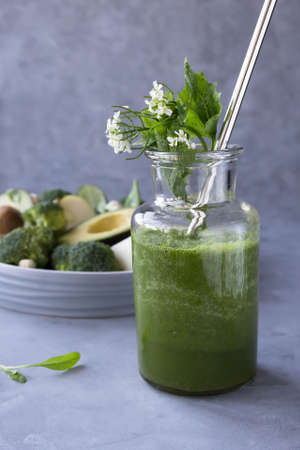 Healthy green smoothie and ingredients - detox, diet, health, vegetarian food concept with vitamin