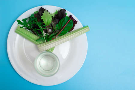 Diet, interval eating, fasting concept. A plate of vegetables depicting a clock, a time slot for a meal. On a blue background.
