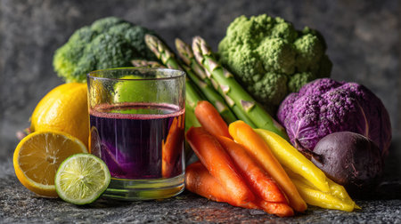 A visually appealing arrangement of fresh vegetables, including broccoli, asparagus, and colorful bell peppers, alongside a glass of juice on a dark stone surface.