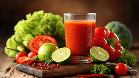 Fresh tomato juice surrounded by colorful vegetables and spices on a rustic wooden table