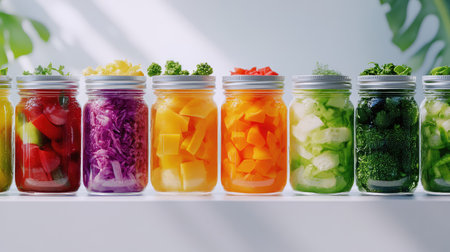 A visually appealing arrangement of colorful jars filled with a variety of fresh vegetables, showcasing a modern and healthy culinary lifestyle in a bright kitchen.