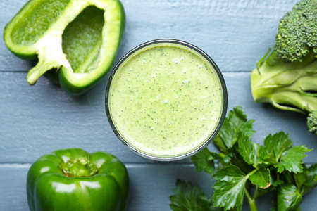 Drinks good for health, diet breakfast concept. Green healthy vegetable smoothie juice glass