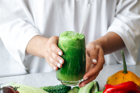 A glass of green smoothie in female hands, detox, diet and healthy eating.