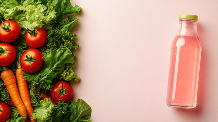 Vibrant tomatoes, crisp lettuce, and carrots paired with a refreshing pink beverage.