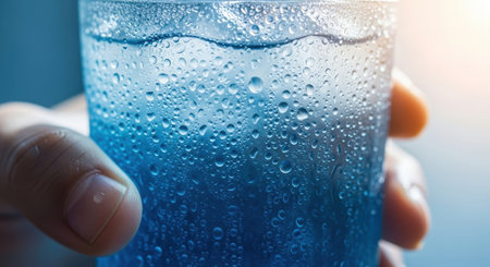 hand holding a glass of water close-up on a blue background