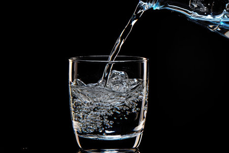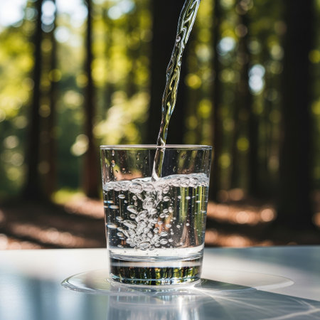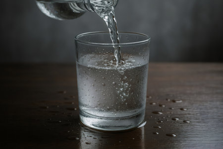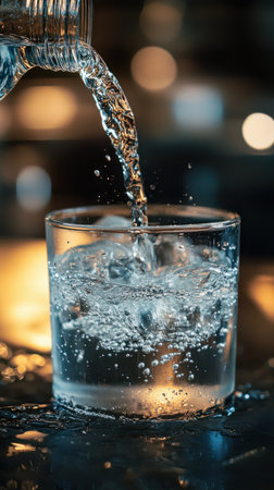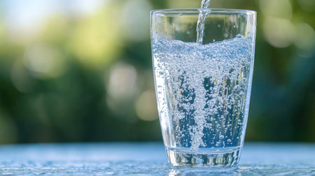 A stunning close-up of fresh water pouring into a glass, creating bubbles as it flows and reflecting light on a calm surface, symbolizing freshness and hydration.