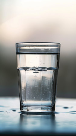 A clear glass fills with fresh water against a blue backdrop. Water droplets glisten on the table, creating a serene scene symbolizing hydration and wellness in a healthy lifestyle.