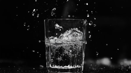 A captivating black and white image showcasing a glass of water with dynamic splashes and bubbles, depicting freshness and elegance in liquid form.
