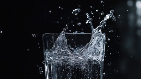 Close-up of a glass of water splashing, capturing motion and fluidity, representing hydration and purity in dynamic detail.