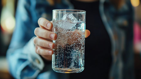 Refreshing sparkling water served in a glass with ice in a casual setting
