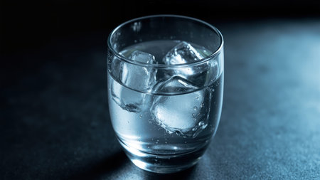 A close-up, macro still life captures a captivating image of a refreshing glass of water with glistening ice cubes. Set against a stark, dark surface, the transparent glass showcases the clear, cold drink, emphasizing its fresh and crisp qualities. Ideal for illustrating hydration and wellness, this image evokes summer and the pure purity of mineral water. Perfect for beverage marketing, promoting healthy lifestyle content, or showcasing refreshment and thirst quenching drinks.