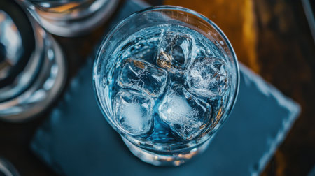 Close-up of a glass of water with ice cubes on a blue background