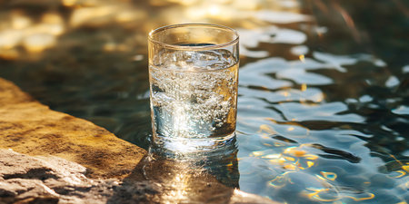 A serene scene of cold, clear mineral water being poured into a glass, showcasing refreshing hydration in a natural outdoor setting filled with sunlight.