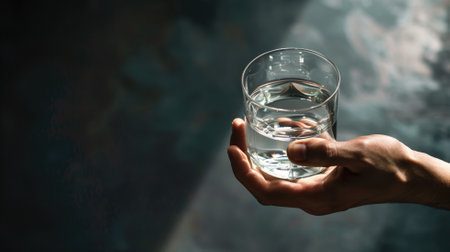 Close-up of hand holding clear glass water with blurred dark background