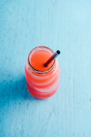 A picture of man's hand holding glass cup of red lemonade. It has straw in it. Isolated on striped and blue background