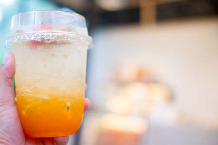 Hand holding a glass of fresh passion fruit juice mix with soda. Tropical cocktail